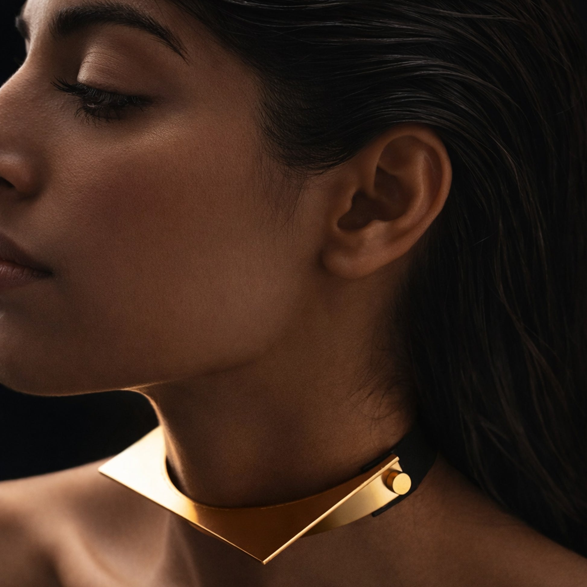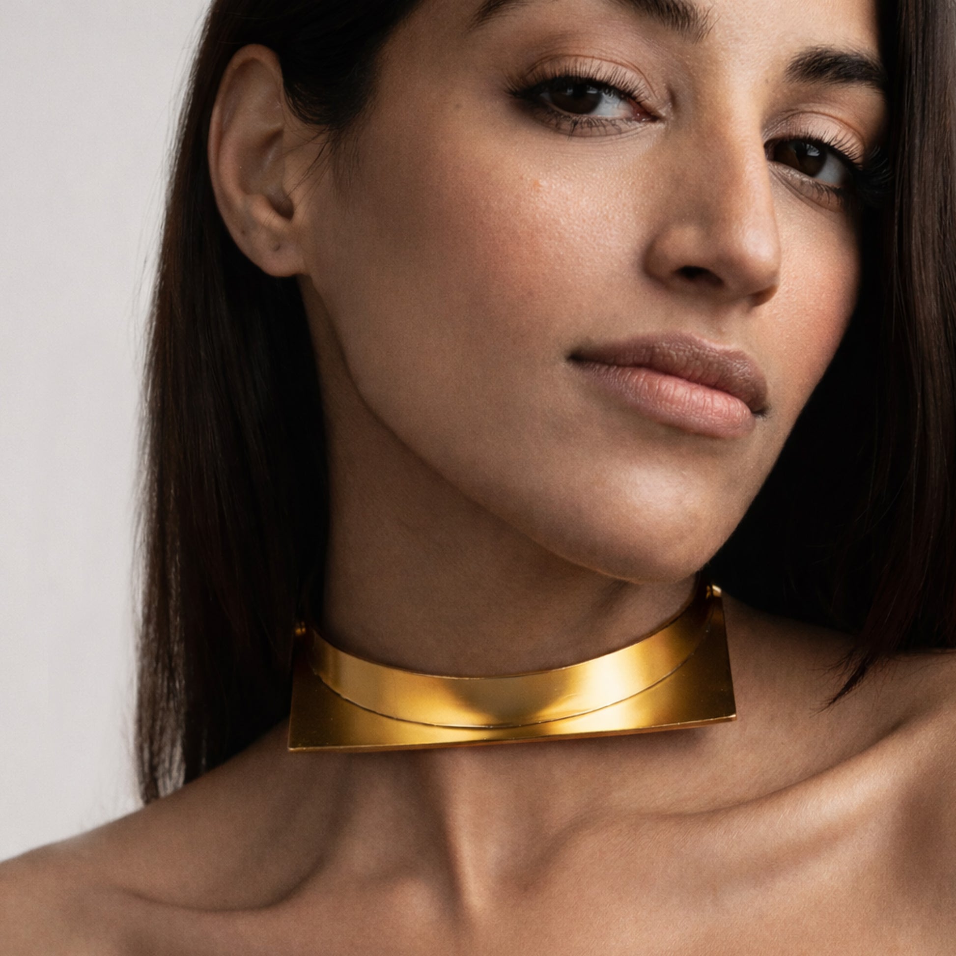 A square split open. Born of "Four", Quadrune arcs around the neck like a lunar fragment, unfinished and full of potential. Structure undone just enough to breathe.